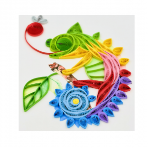 This quilling card shows a vibrant chameleon created from detailed and colorful paper coils. The playful curves and bright tones make the design lively, unique, and highly decorative. It is an ideal handmade card for animal lovers and art enthusiasts.