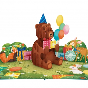 Bring the magic of the forest to life with our Woodland Party 3D Pop-Up Card! This charming design is a perfect choice for nature lovers and little adventurers, turning a birthday wish into an enchanting meadow celebration. When opened, a sweet brown bear wearing a party hat "pops" into view, holding a colorful bouquet of balloons and a stack of birthday gifts. The front of the card features a delightful teaser of the bear and his balloons against a bright blue sky, creating a perfect first impression.