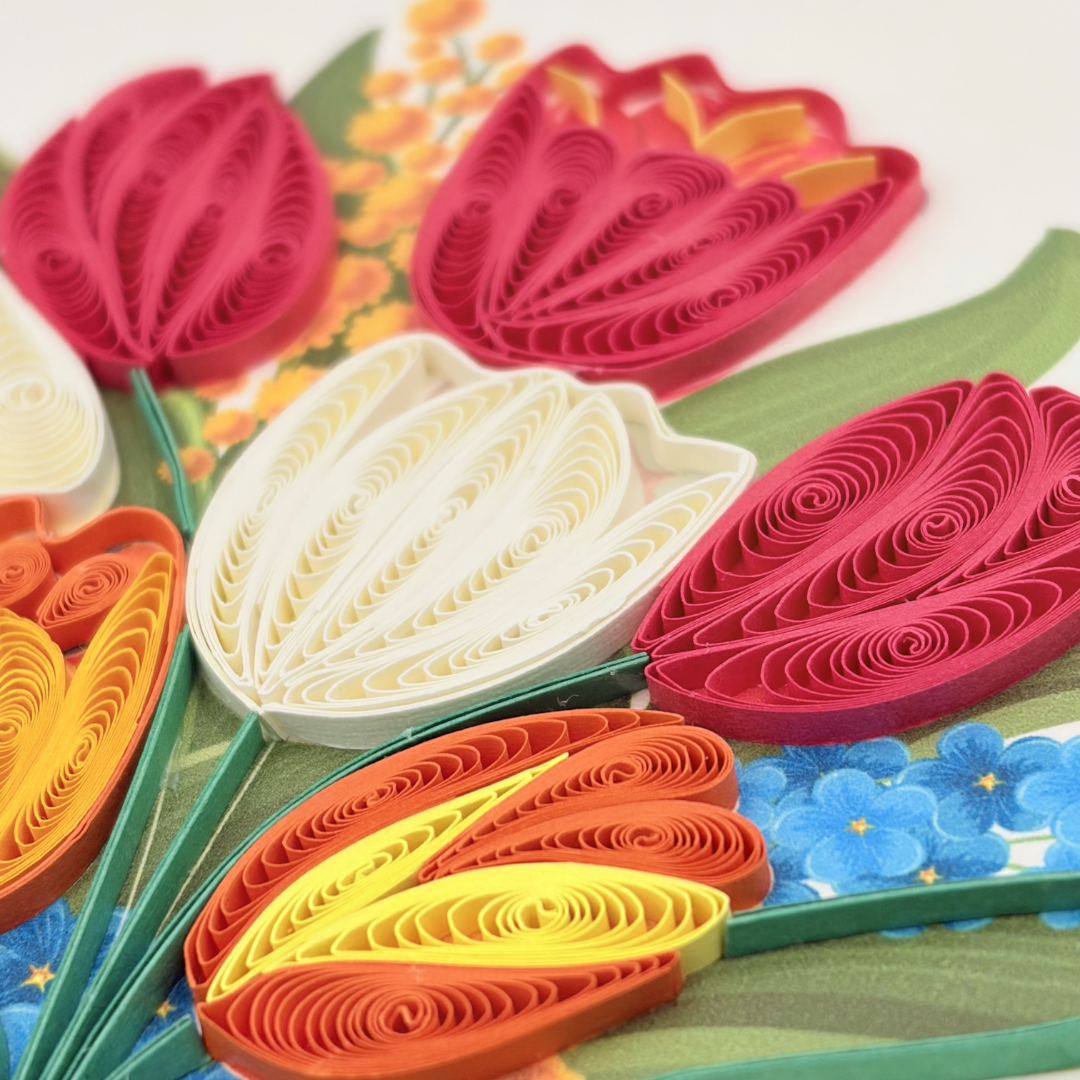 Quilling is a delicate paper art form where thin strips of paper are carefully rolled, shaped, and glued together to create decorative designs full of life and emotion. Resting on a lively printed background, the paper coils are arranged to add texture, depth, and artistic flair to the card.