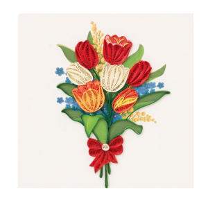 This quilling card features a charming bouquet of flowers crafted from meticulously shaped paper coils. The bright white petals, yellow centers, and soft green stems bring a fresh and joyful look, radiating feelings of happiness and natural beauty. It is an ideal handmade card to express warm wishes, gratitude, and affection.