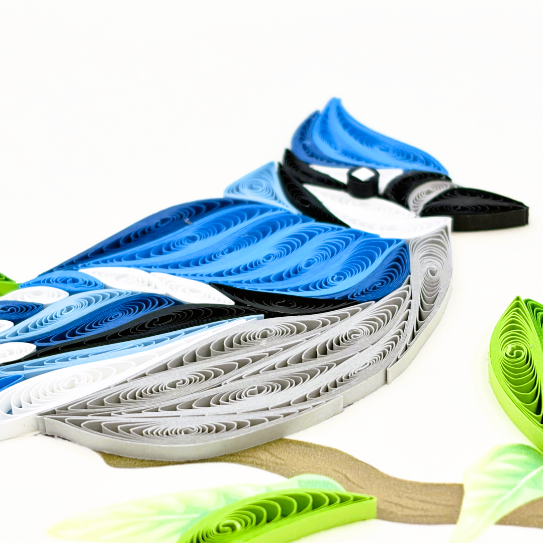 Capture the beauty of nature with this elegant quilling card featuring a graceful blue jay perched on a branch. Crafted from carefully rolled paper strips, every feather detail is brought to life with precision and artistry.