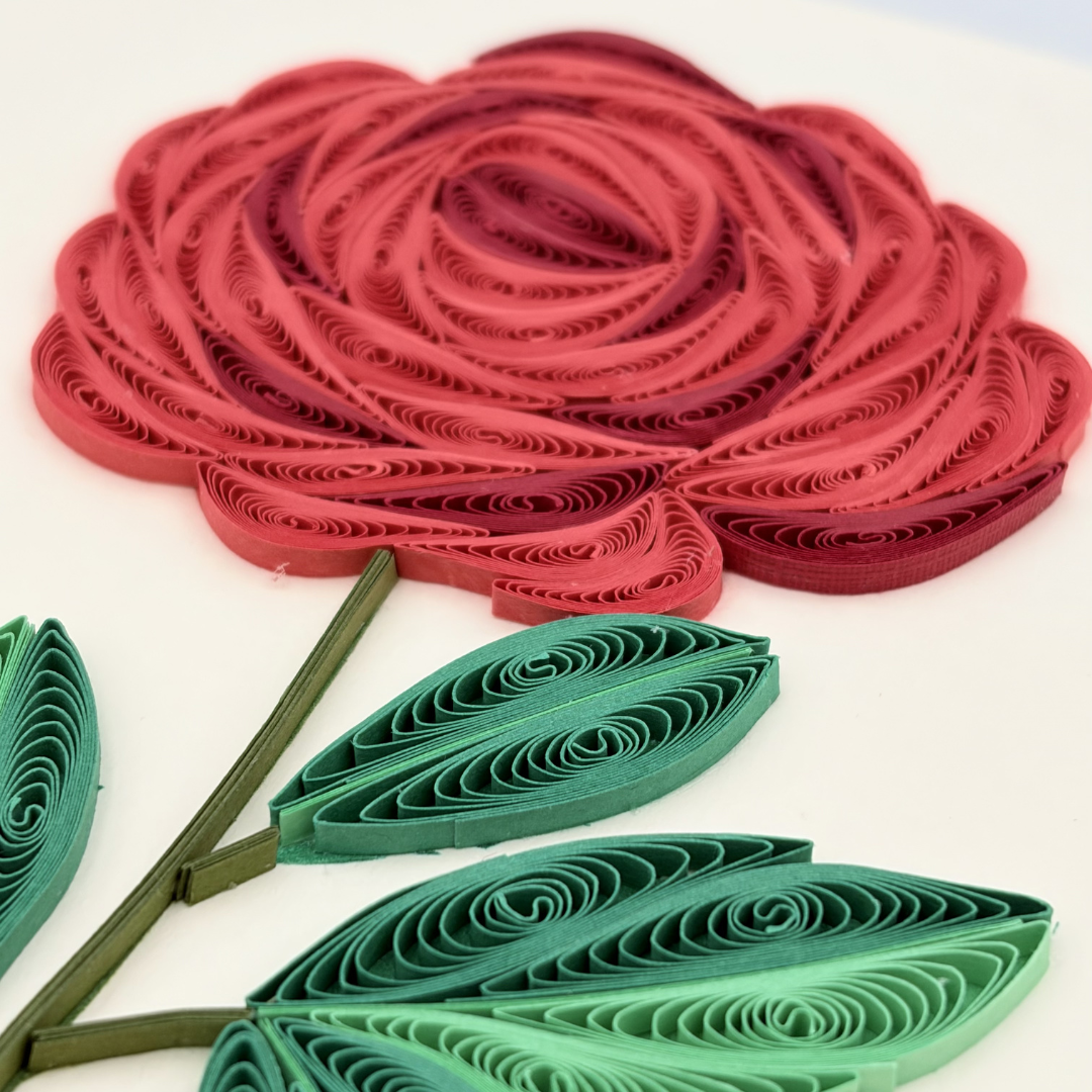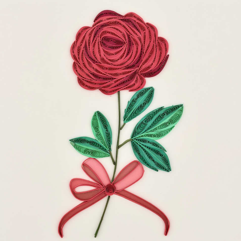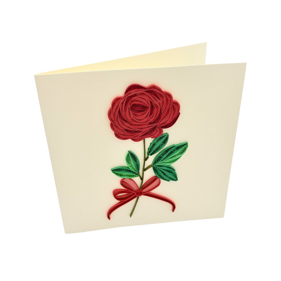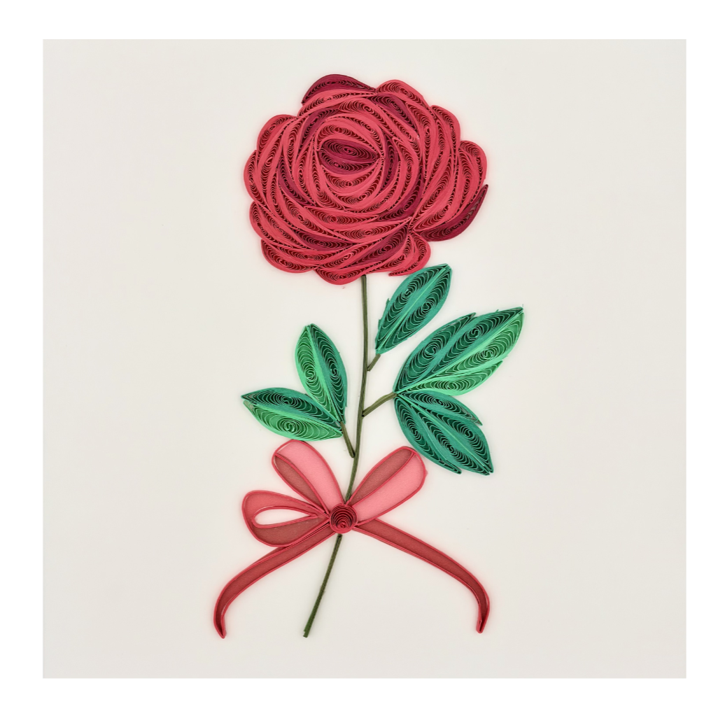 This quilling card features a single rose branch with one blooming rose and two green leaves, crafted from carefully shaped paper coils. The elegant curves and soft details create a romantic and graceful design, making the card eye-catching and meaningful. It is a perfect handmade card to express love, appreciation, and heartfelt emotions.