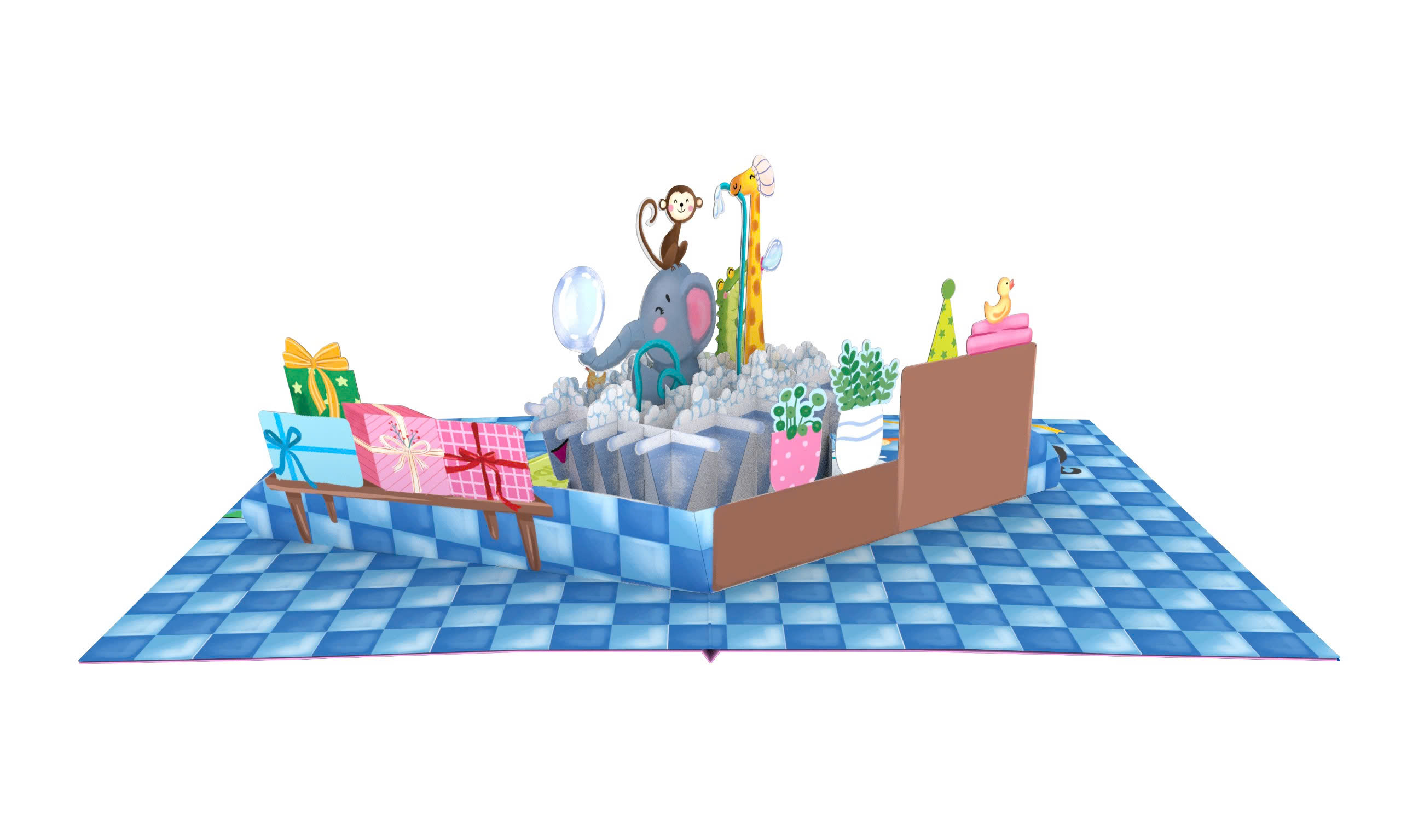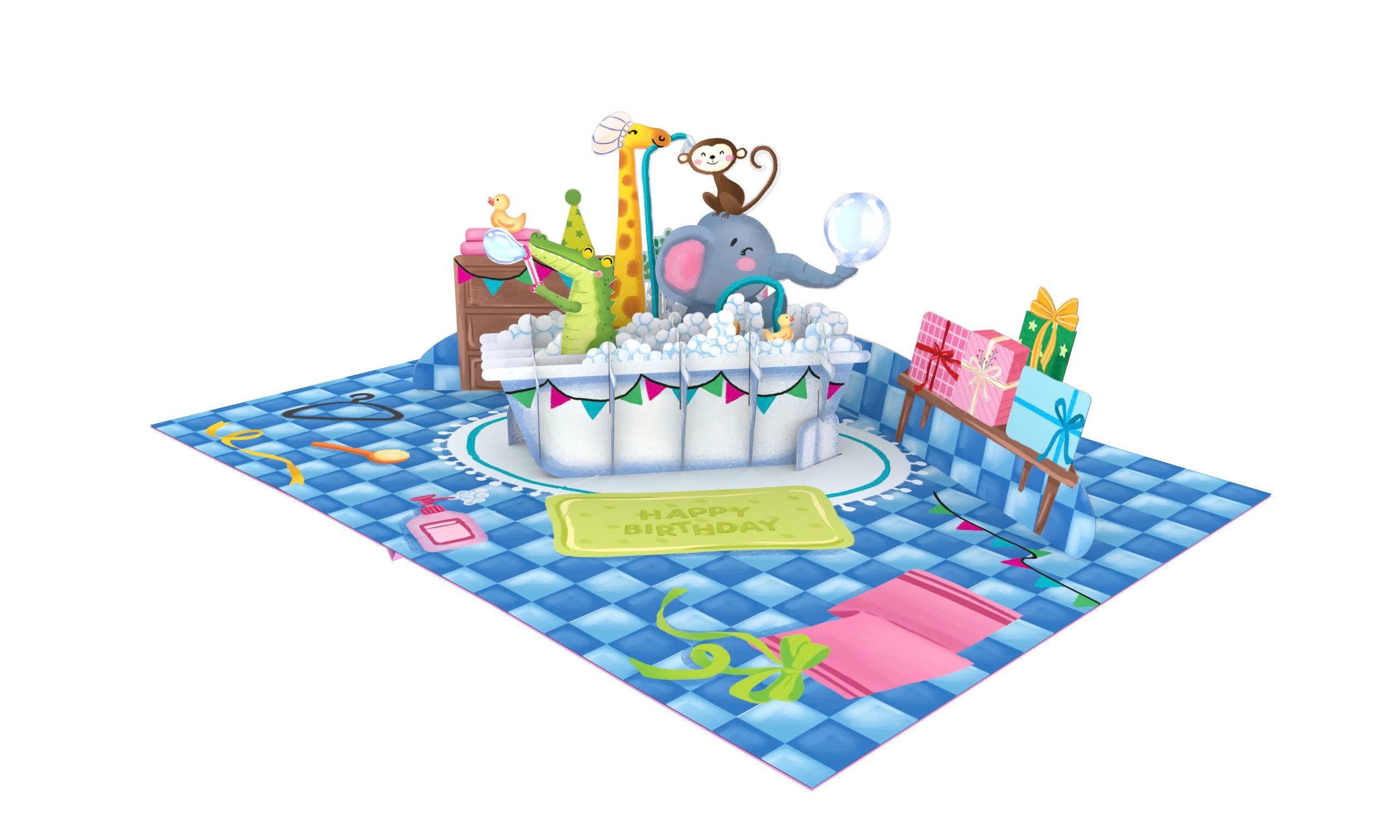 Open the card to reveal a joyful party featuring a friendly elephant, giraffe, crocodile, and monkey sharing a bubble bath filled with "Happy Birthday" magic.From the tiny rubber duckies to the colorful bunting and floating bubbles, every element is precision-cut to create a vibrant, multi-layered bathroom bash.Celebrate in style and send a wave of happiness with this unique pop-up surprise!