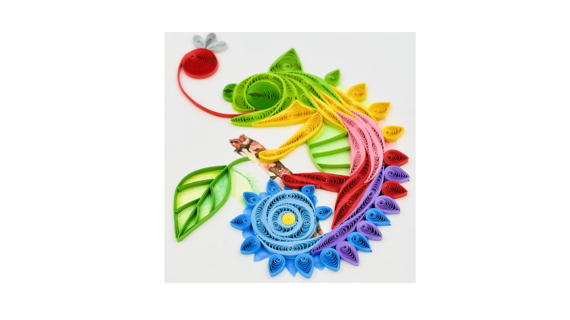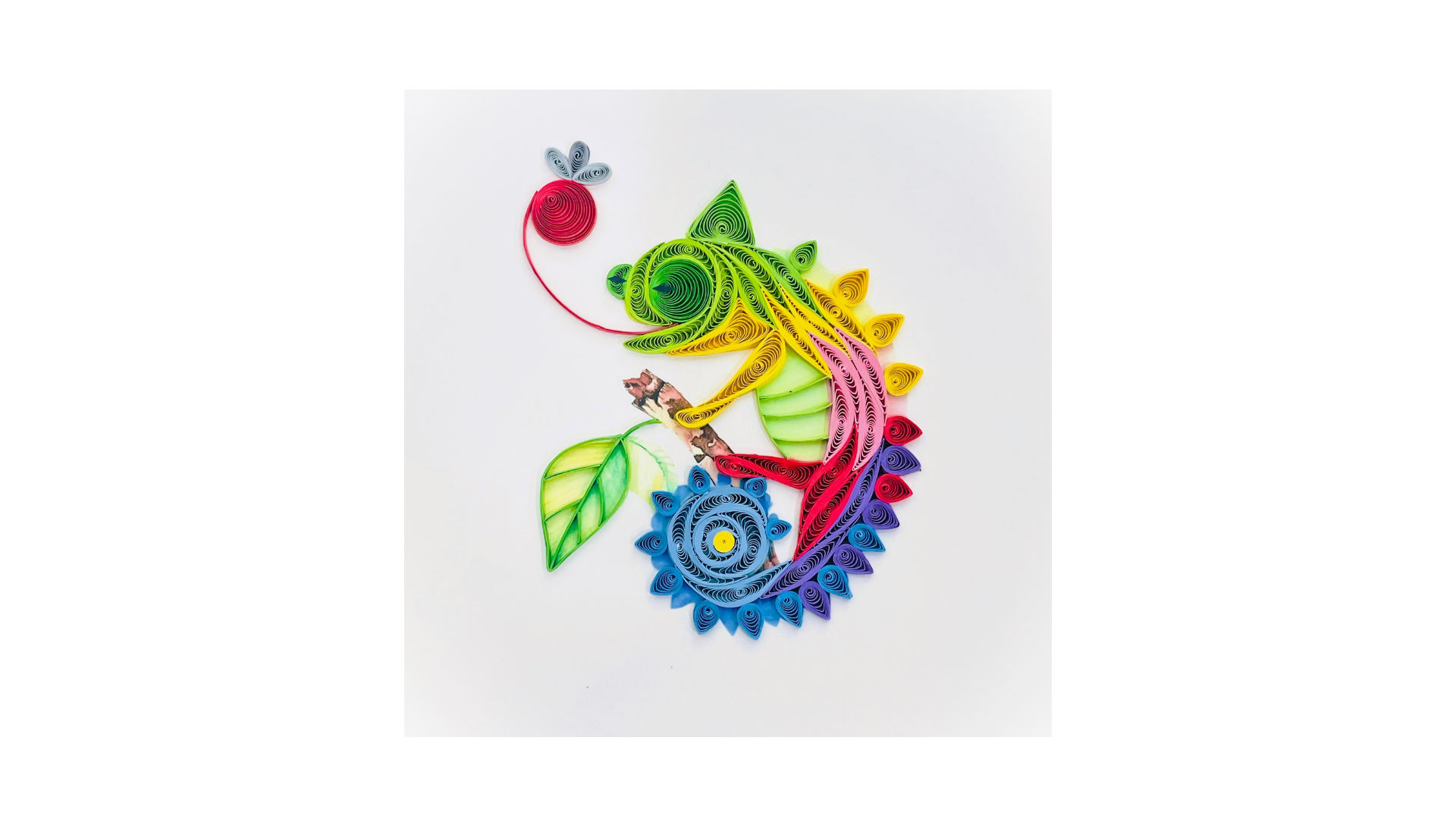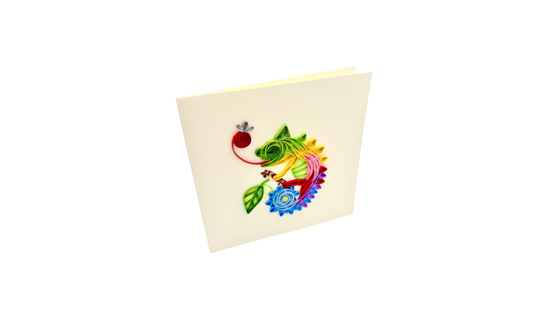 This quilling card shows a vibrant chameleon created from detailed and colorful paper coils. The playful curves and bright tones make the design lively, unique, and highly decorative. It is an ideal handmade card for animal lovers and art enthusiasts.
