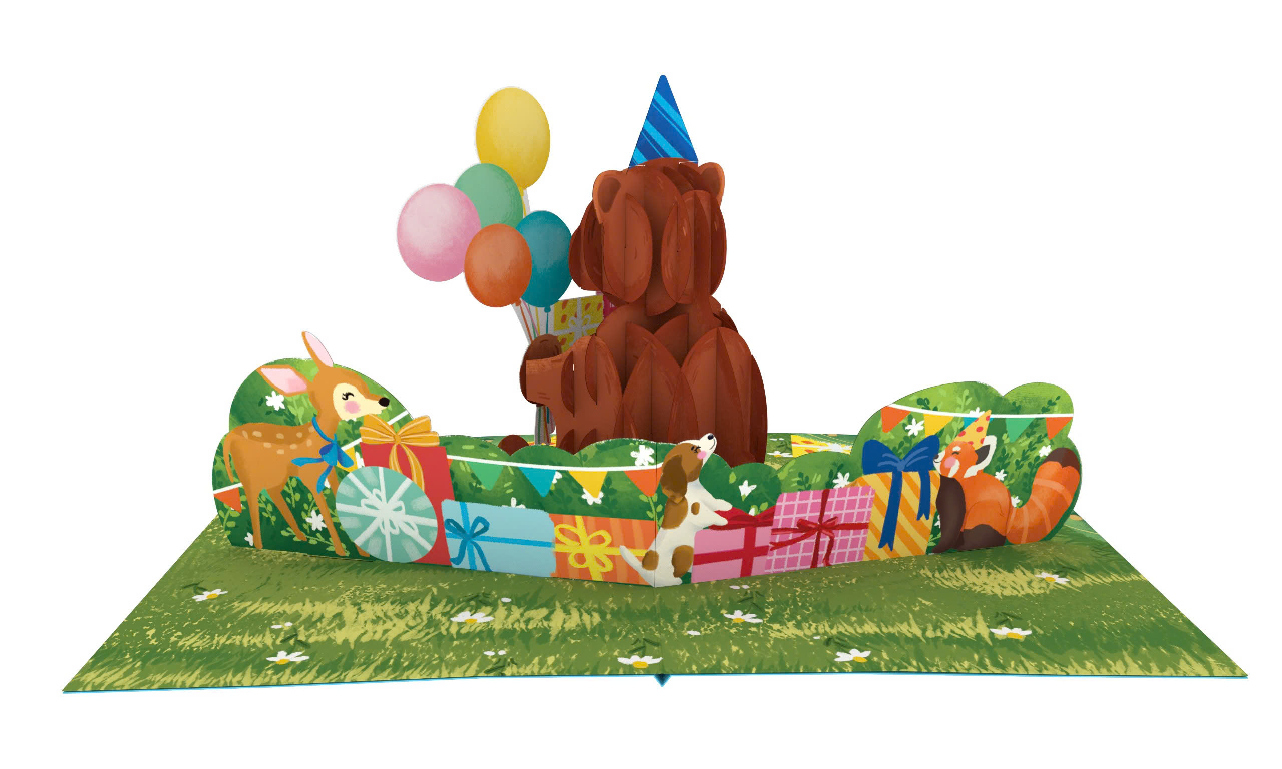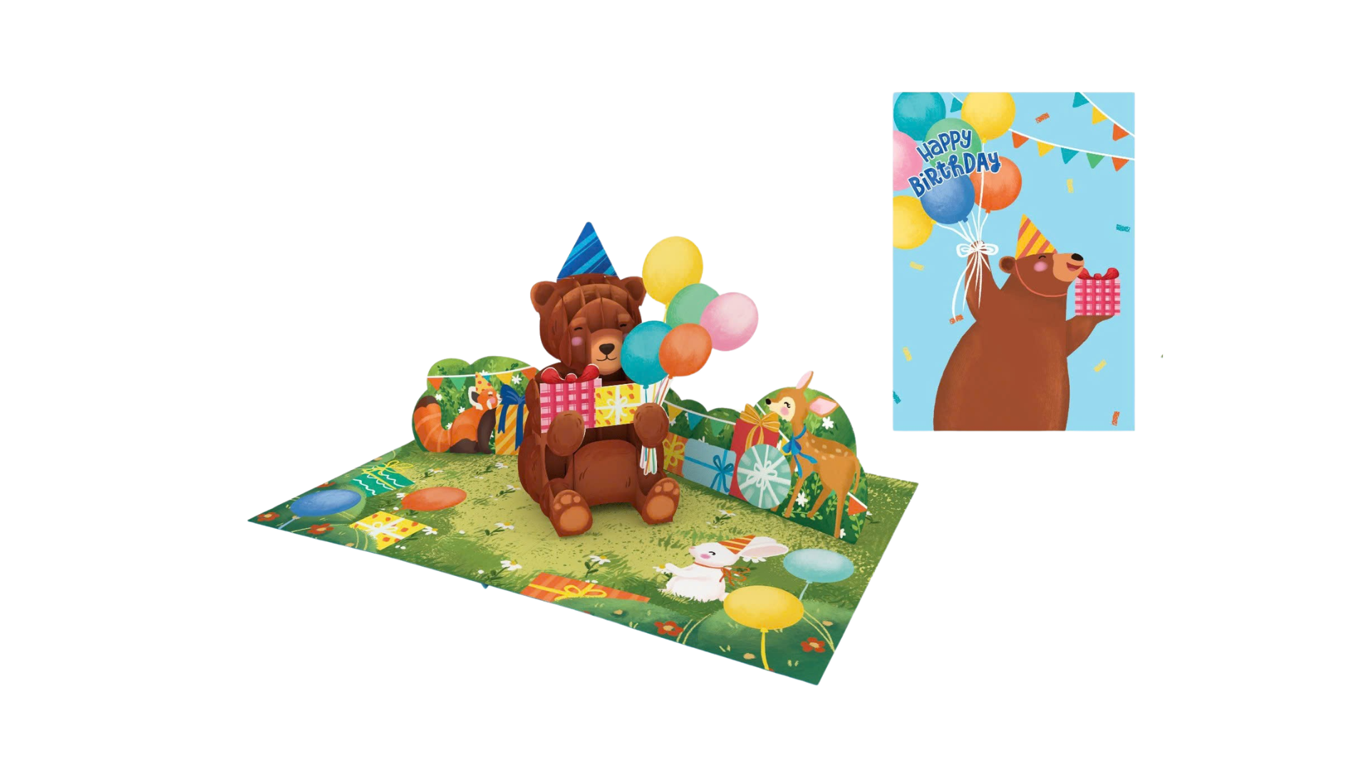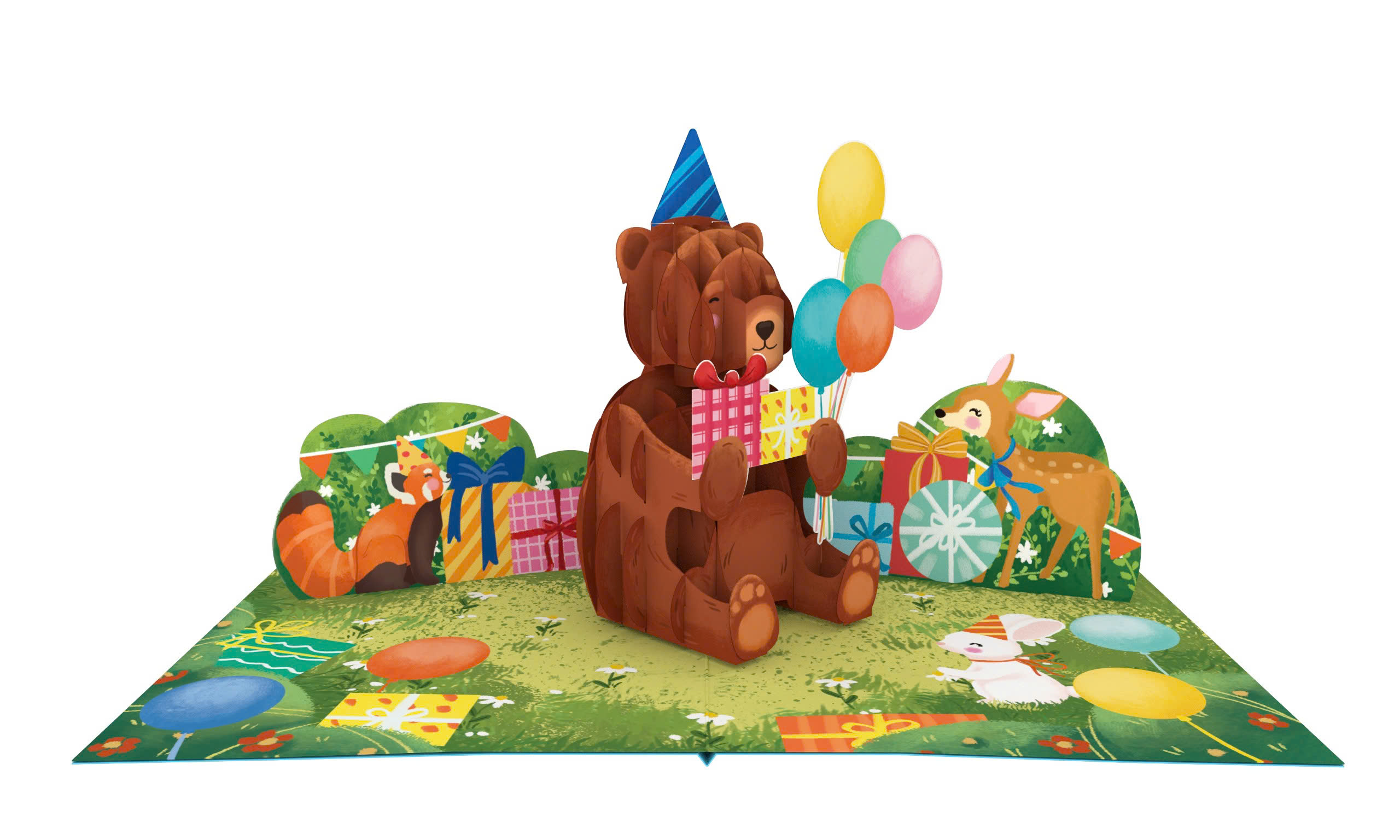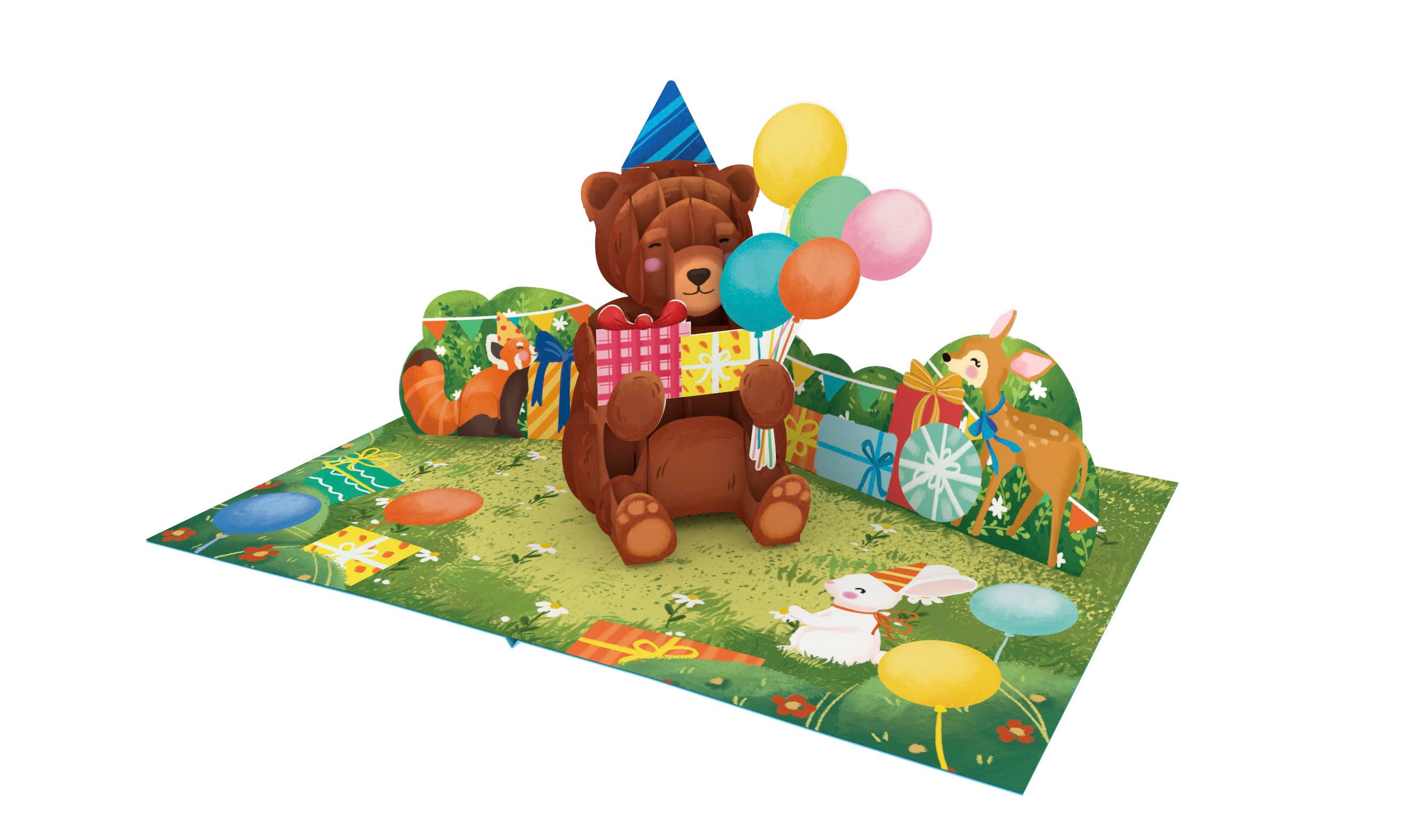 Bring the magic of the forest to life with our Woodland Party 3D Pop-Up Card! This charming design is a perfect choice for nature lovers and little adventurers, turning a birthday wish into an enchanting meadow celebration. When opened, a sweet brown bear wearing a party hat "pops" into view, holding a colorful bouquet of balloons and a stack of birthday gifts. The front of the card features a delightful teaser of the bear and his balloons against a bright blue sky, creating a perfect first impression.