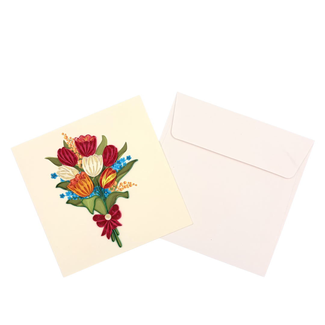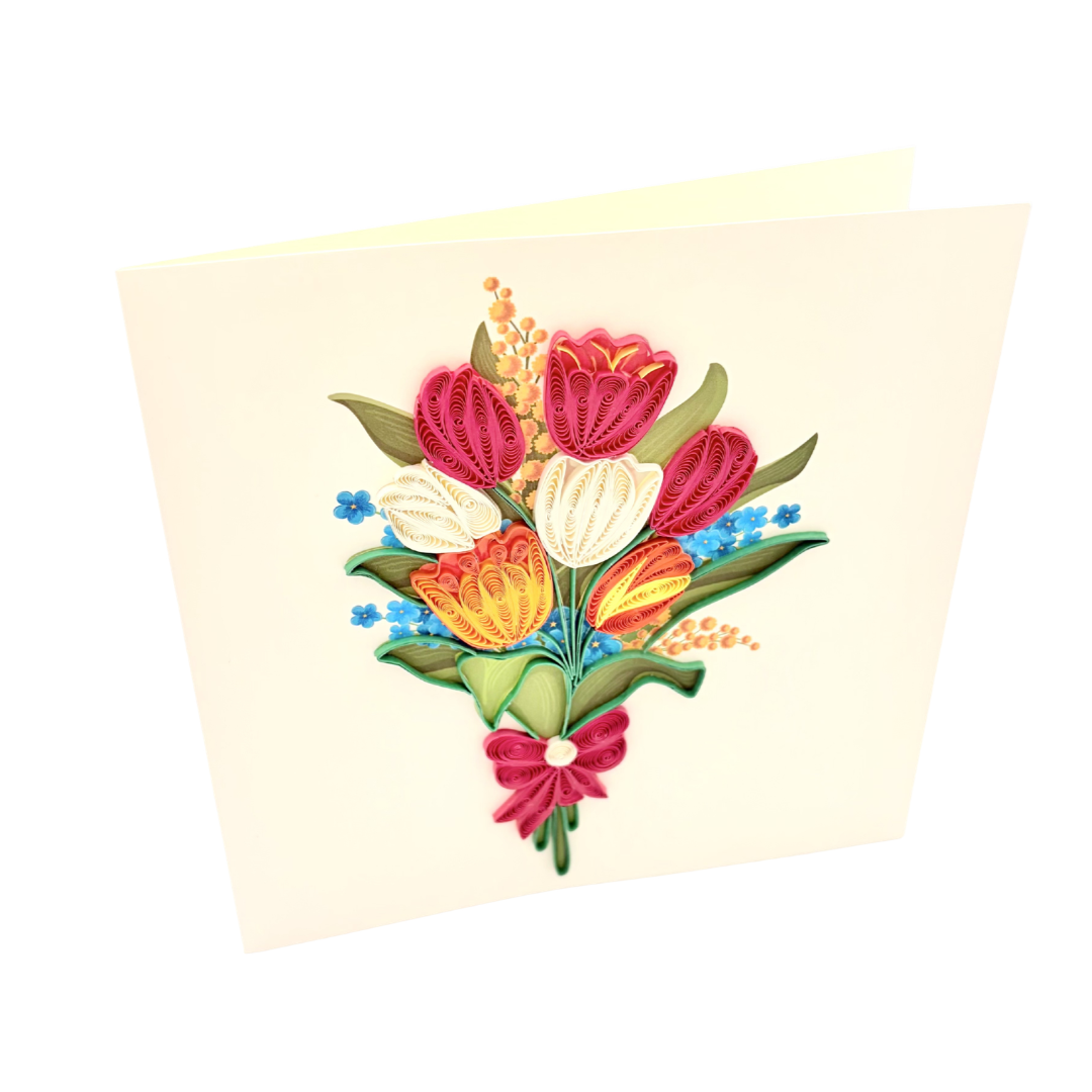 This quilling card features a charming bouquet of flowers crafted from meticulously shaped paper coils. The bright white petals, yellow centers, and soft green stems bring a fresh and joyful look, radiating feelings of happiness and natural beauty. It is an ideal handmade card to express warm wishes, gratitude, and affection.