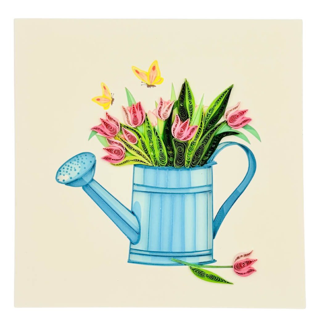 This design showcases a charming blue watering can filled with blooming flowers, accented by fluttering butterflies. The vibrant quilled petals and leaves add depth and freshness, creating a cheerful and uplifting visual that celebrates nature and growth.
