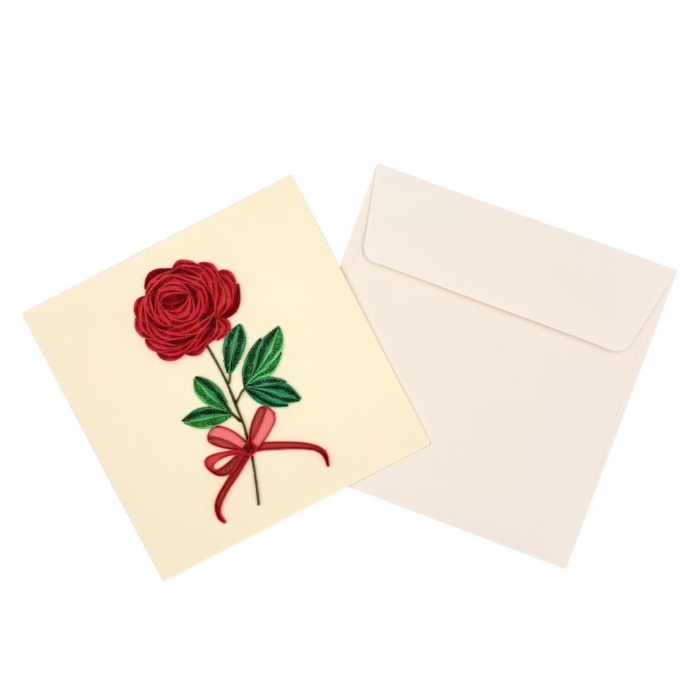 This quilling card features a single rose branch with one blooming rose and two green leaves, crafted from carefully shaped paper coils. The elegant curves and soft details create a romantic and graceful design, making the card eye-catching and meaningful. It is a perfect handmade card to express love, appreciation, and heartfelt emotions.