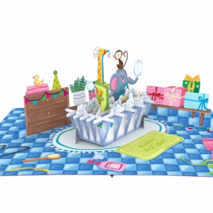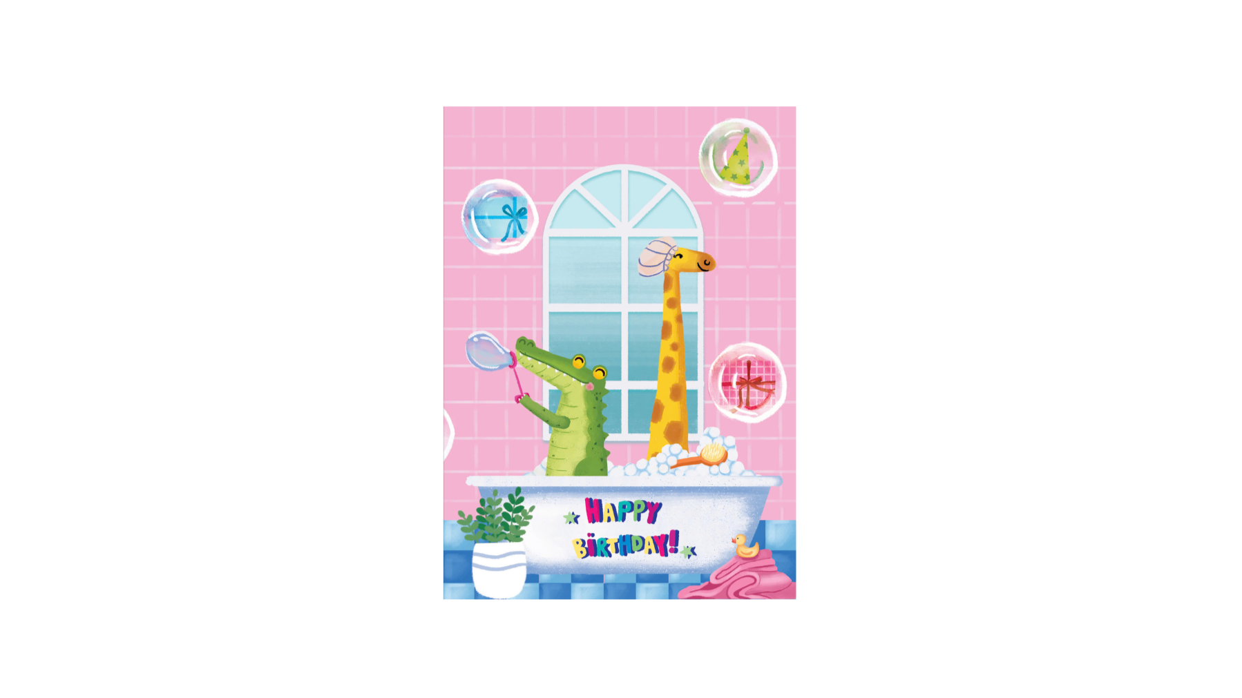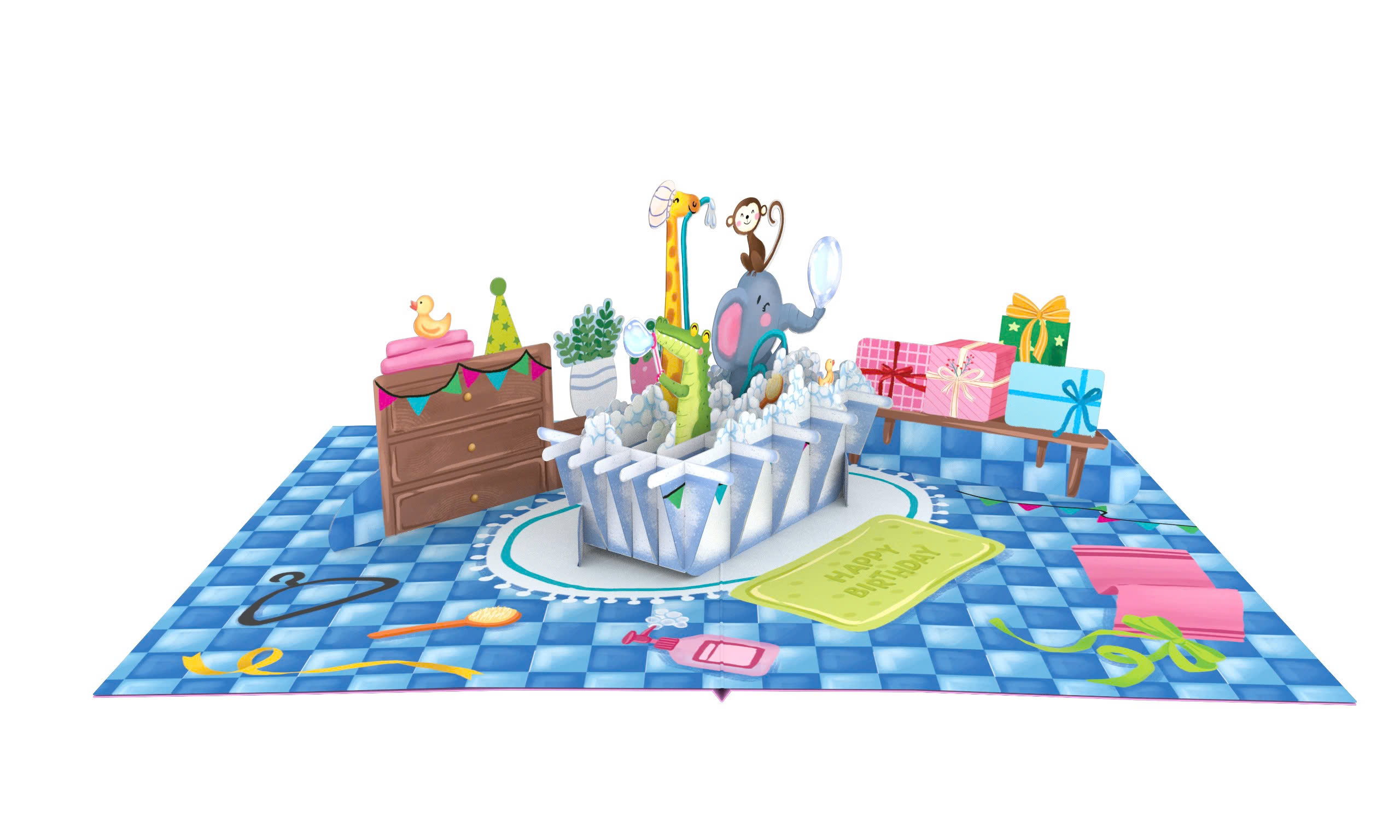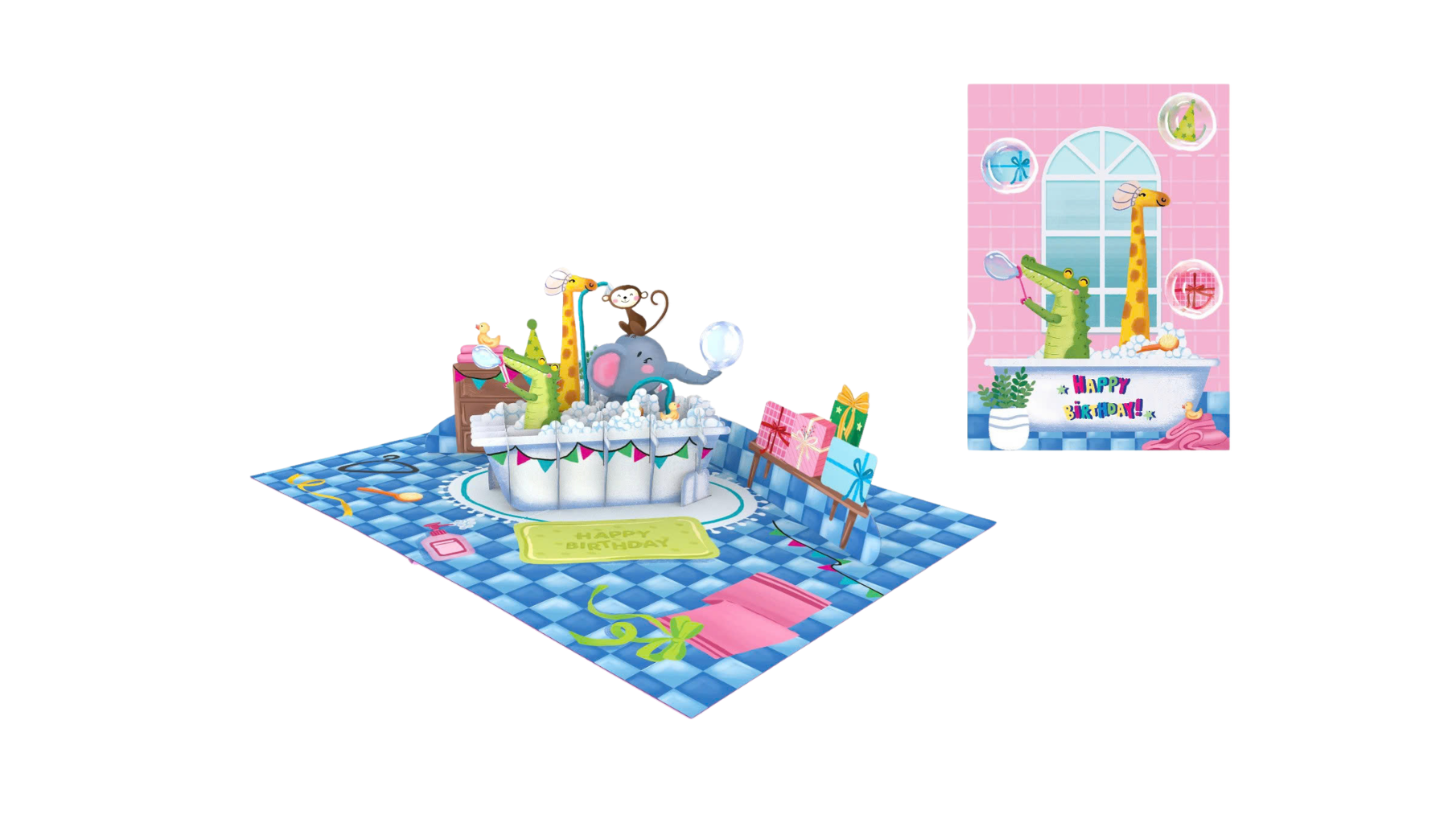 Open the card to reveal a joyful party featuring a friendly elephant, giraffe, crocodile, and monkey sharing a bubble bath filled with "Happy Birthday" magic.From the tiny rubber duckies to the colorful bunting and floating bubbles, every element is precision-cut to create a vibrant, multi-layered bathroom bash.Celebrate in style and send a wave of happiness with this unique pop-up surprise!