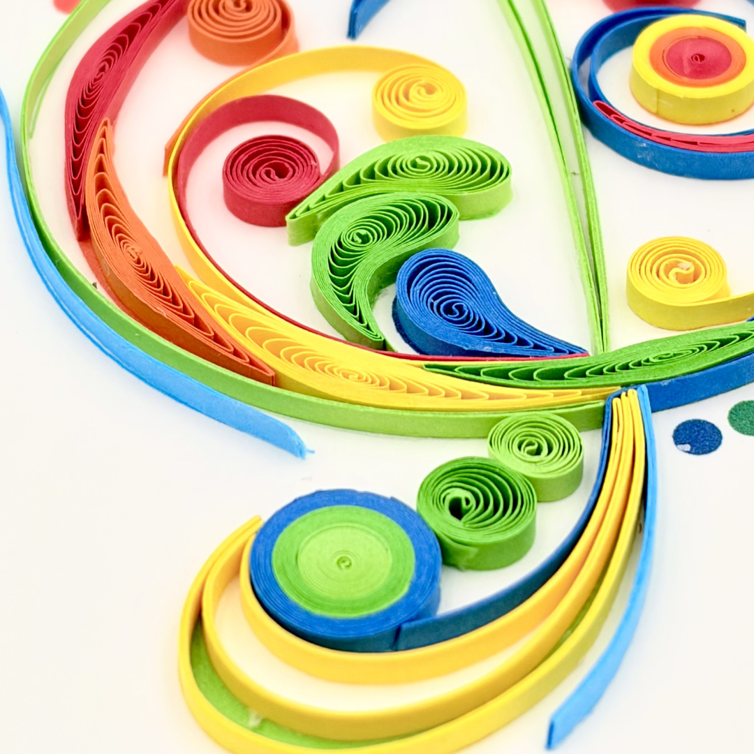 Quilling is an elegant paper art where thin paper strips are rolled and shaped into detailed decorative designs. Placed on a lively printed background, the paper coils bring motion and emotion to the card.