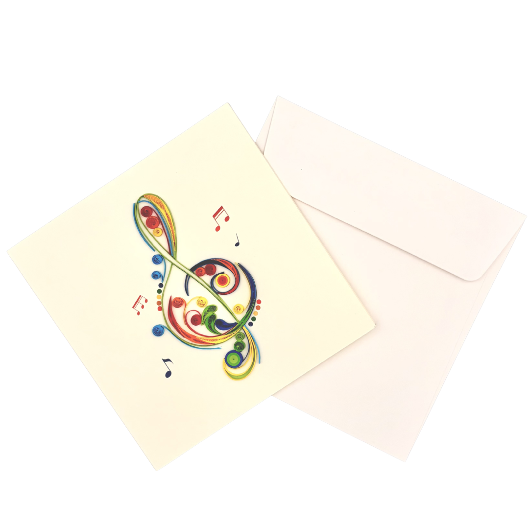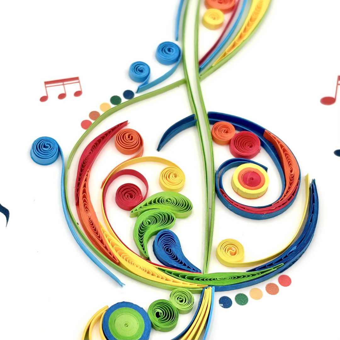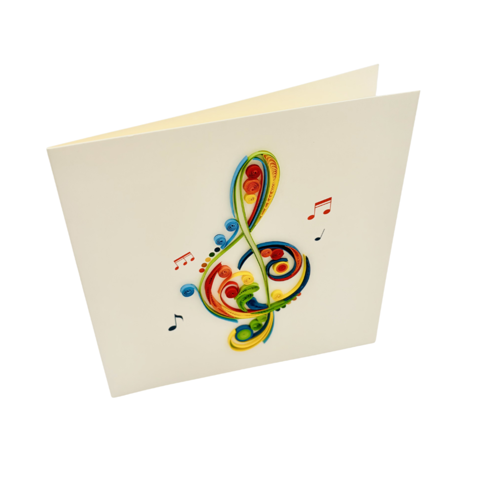 This quilling card features a colorful treble clef symbol with musical notes made from carefully shaped paper coils. The dynamic and artistic design makes it a perfect handmade card for music lovers, musicians, teachers, and performers.